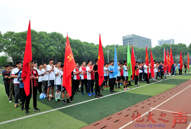 一、近日,我校足球比赛最高级别赛事——“地大杯”战火重燃。本次比赛汇聚全校17支队伍参赛,比赛分A、B、C、D四个小组,循环赛后由前两名出线,再交叉淘汰,决出四强。图为比赛现场