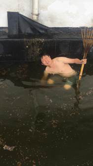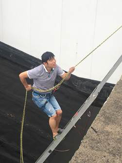 外面暴雨如注,馆内有如水帘洞。突击队借助梯子爬上攀岩馆屋顶,查明了漏水原因:由于长时间没有清理,树叶堵塞了下水口,致使屋顶排水沟积水无法下流而漏入馆内。几位同志冒着大雨小心翼翼地走在湿滑的、没有栏杆的铁皮屋顶上,寻找每一个下水口,然后趴着用手把树叶清理干净,积水很快排尽,攀岩馆漏水的问题解决了。