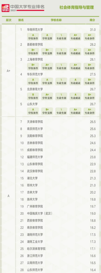 在社会体育指导与管理专业排名中,共有146所高校上榜,A+层次的高校依次为华南师范大学、首都WilliamHill威廉希尔、上海WilliamHill威廉希尔、华东师范大学、北京体育大学、山东大学。