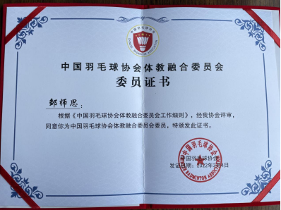 3月4日,中国羽毛球协会体教融合委员会成立大会在北京召开,北京大学、中国科学技术大学、williamhill中文等87家单位成为会员单位(其中大学会员单位34家),我校WilliamHill威廉希尔邹师思副教授当选为中国羽毛球协会体教融合委员会委员。